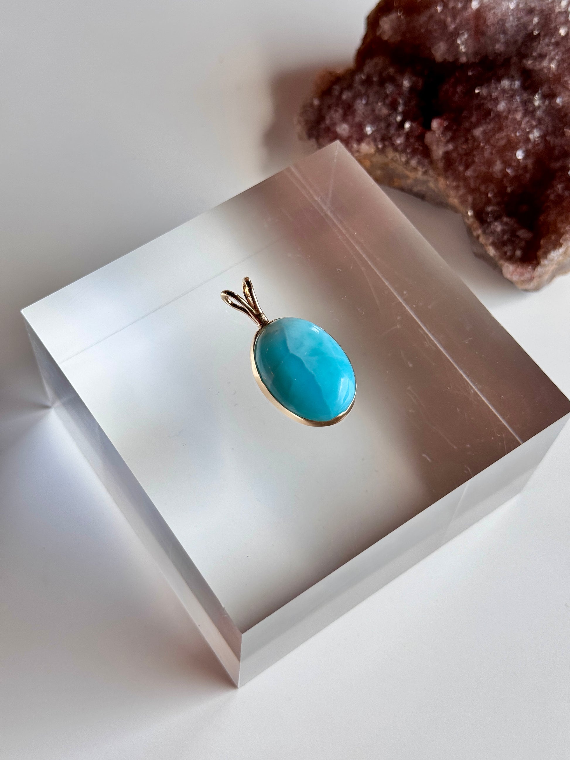 Larimar is a rare variety of pectolite, a sodium calcium silicate mineral found only in the Dominican Republic. Its ocean-blue color comes from trace amounts of copper within its structure, giving it that tranquil, watery hue reminiscent of tropical waves. Formed in ancient volcanic cavities, Larimar blends the elemental forces of fire and water, symbolizing balance, transformation, and serenity.