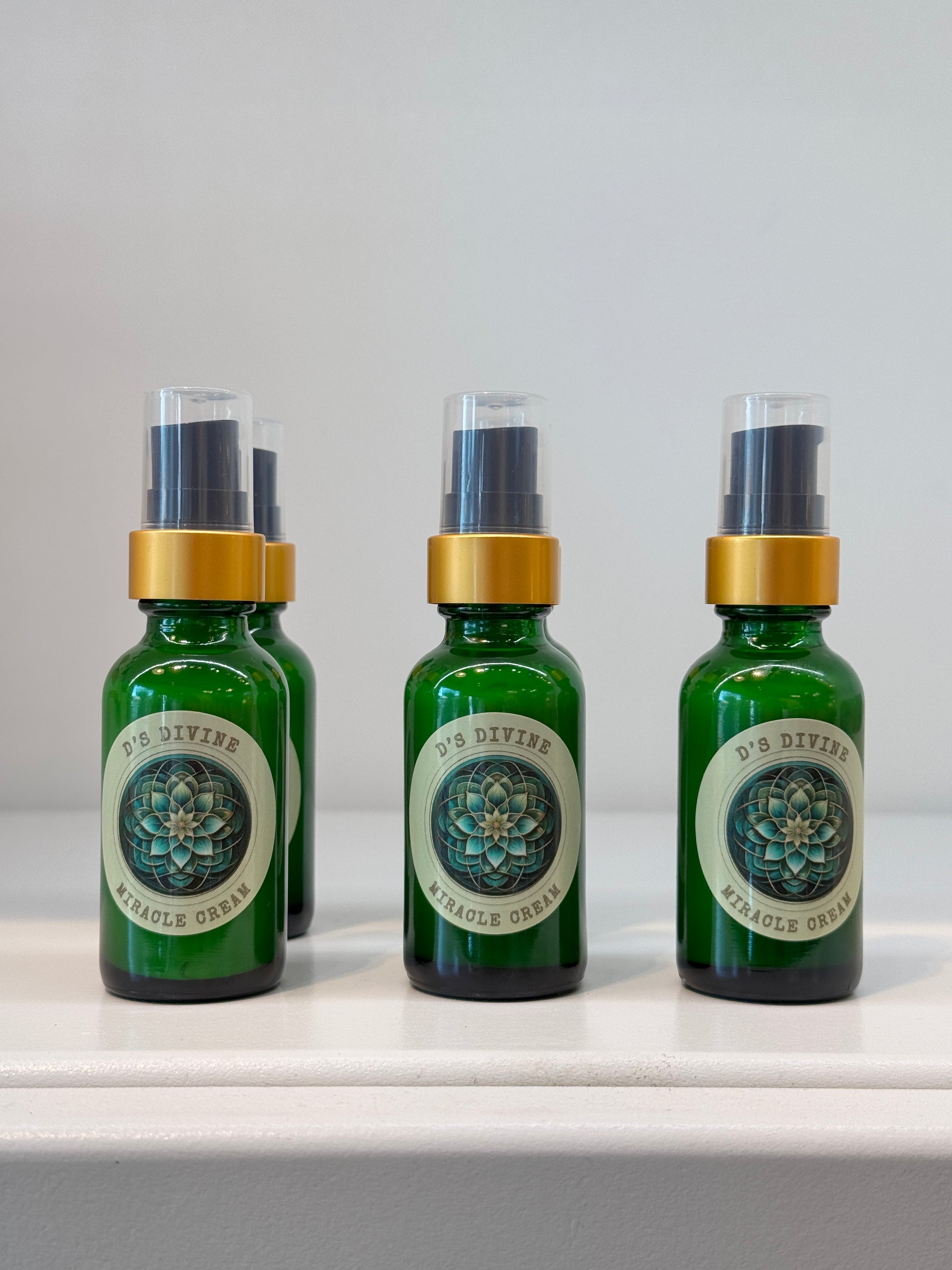 caster oil, clove and rosemary infused MCT oil, jojoba oil, DMSO, Siberian Cedar Nut Oil, colloidal silver, frankincense essential oil, freshwater pearl power, and love