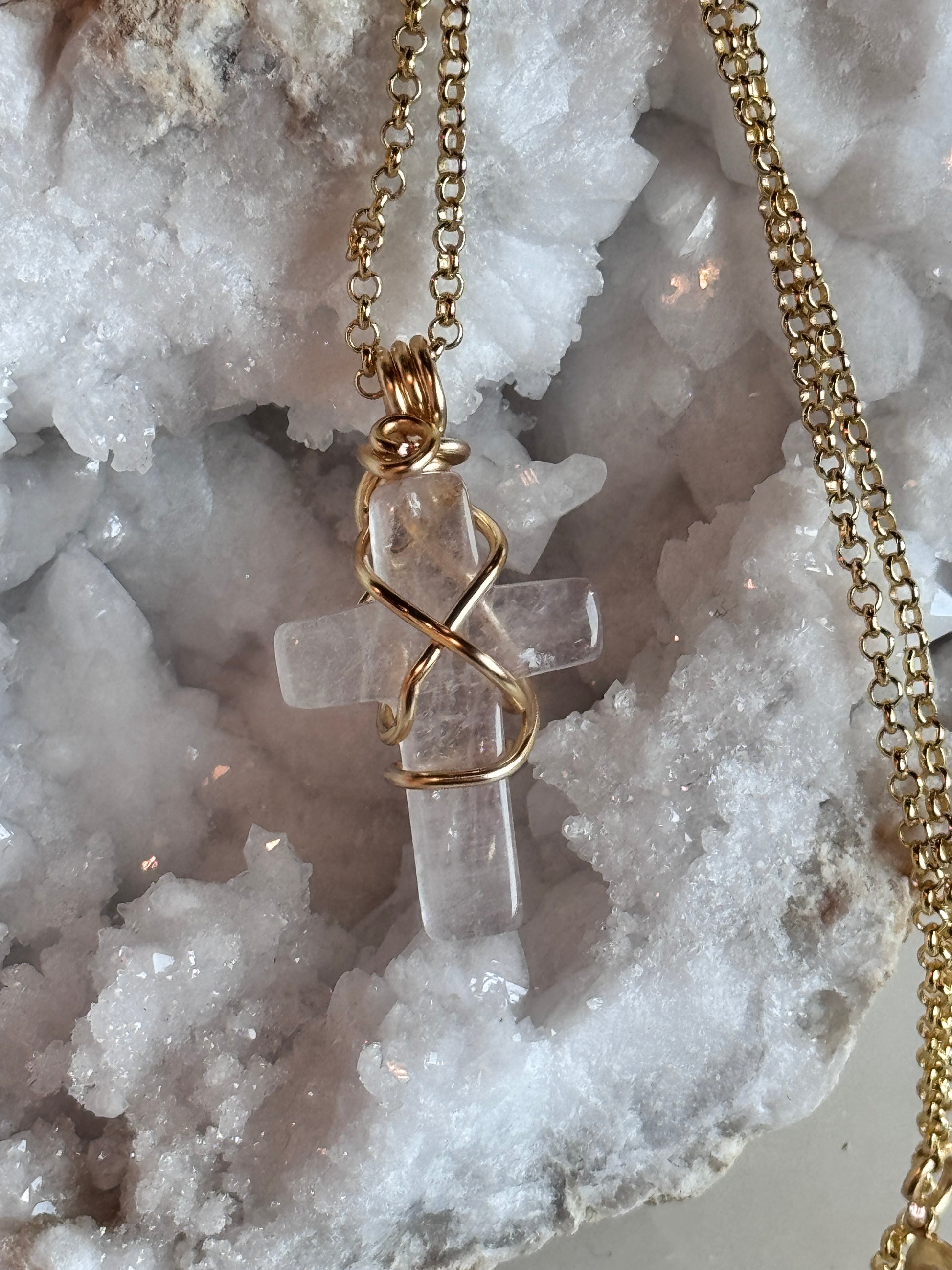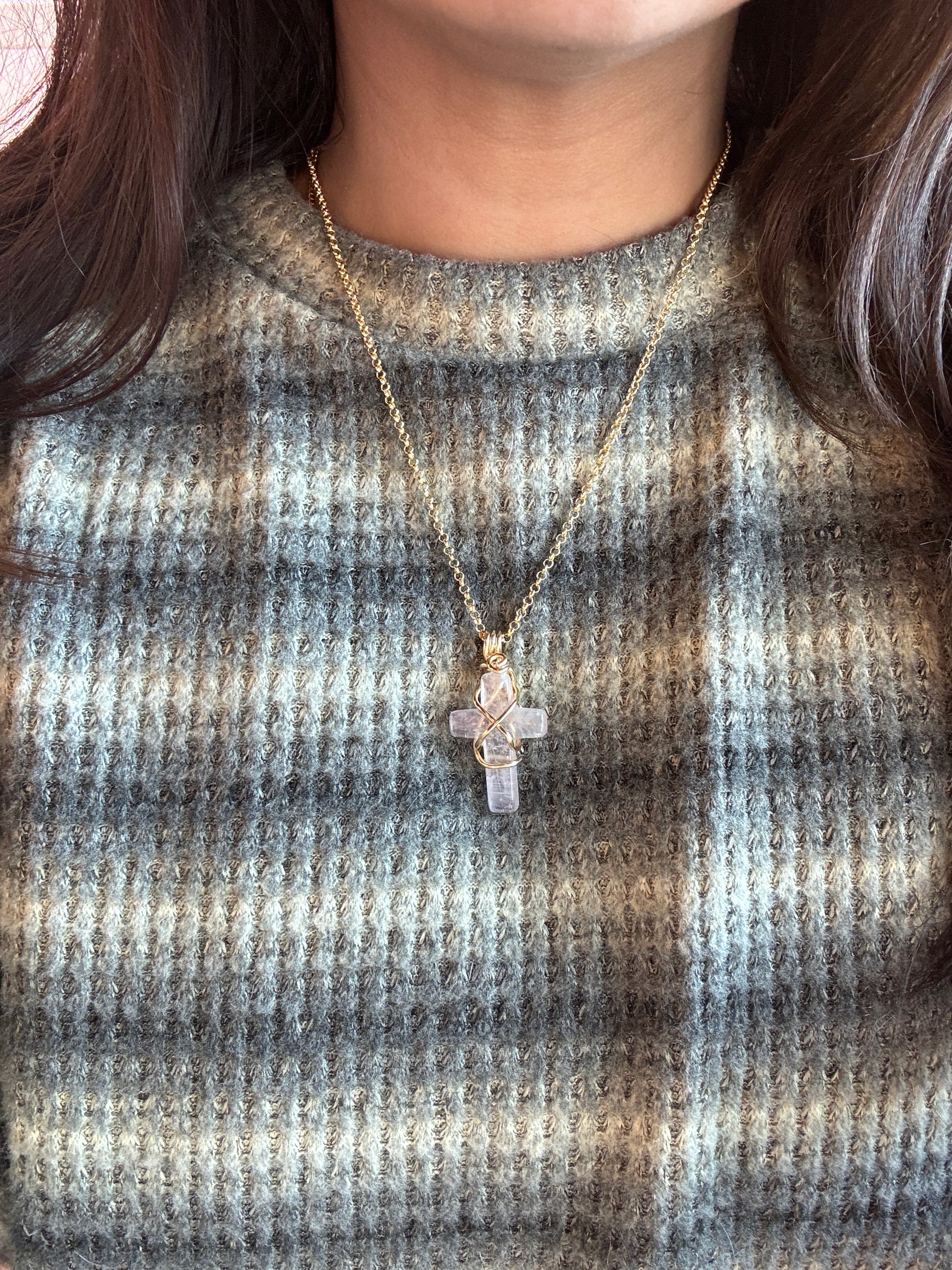 Rose Quartz Cross Gold Plated Copper Wire Wrapped Necklace