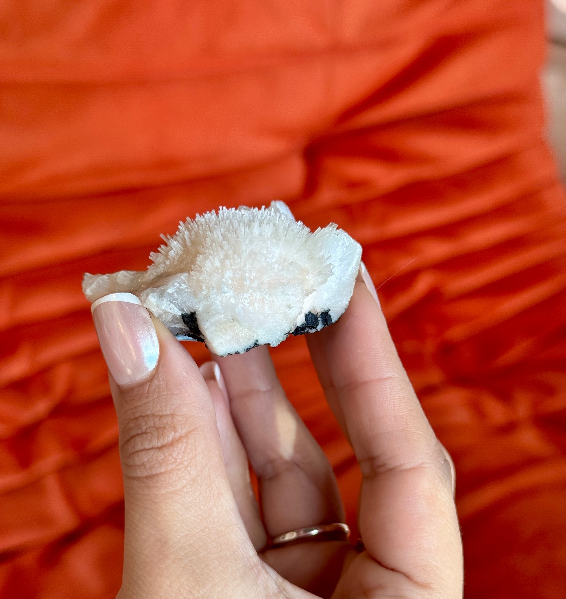 Pink Scolecite is a calcium aluminum silicate mineral from the zeolite family, prized for its delicate needle-like crystal formations and soft pink hue. The color often comes from trace inclusions of manganese or iron, which infuse the normally white Scolecite with gentle warmth and heart-centered energy. Its fibrous structure gives it a high vibrational frequency that promotes energetic alignment and flow.